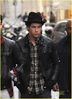 Os Jonas Brothers se mantêm aquecidos com suas jaquetas de couro e sobretudo preto enquanto eles passeiam pelas rua de Milan, na Itália, na sexta de manhã (6 de novembro).